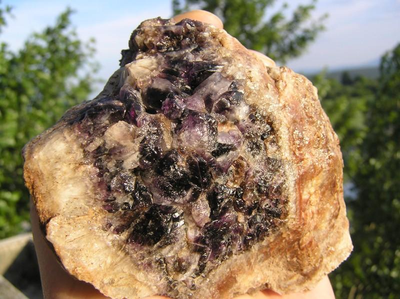 Podobně jako v temné předpovědi slavného Choda jsme se skoro na den přesně, do roka a do dne, vrátili na lokalitu ametystu nedaleko od Milevska, kde jsme loni našli velmi zajímavý materiál vhodný k leštění i "jen tak " do sbírky. K lokalitě jsme se tentokrát snažili dostat z druhé strany, abychom nemuseli překonávat nepříjemně hlubokou rokli malého potoka, nad nimž se tato lokalita nachází. Po asi půlhodině tápání, kdy navíc Láďa zdržoval sbíráním jarních bylinek či čehosi podobného, jsme se konečně trefili. Cíl zněl jasně : najít primár, ze kterého ametystový materiál pochází.Po chvíli hrabání, kdy se Láďa trefil hned napoprvé do toho správného materiálu, se zdálo, že jsme na vytoužené žíle. Ametysty byly docela syté a tu a tam na nás z hlíny vykouklo pěkné fialové oko ohraničené svůdnou morionovou linkou. Nejednalo se však o litou křemennou žílu, zdálo se, že jde spíš o jakýsi žilník, podobný lokalitě v Přeborově. Za nějaký čas jsme uslyšeli, jak se po cestě, která vede těsně nad lokalitou, blíží auto. Nestojíce o problémy, naskákali jsme, naštěstí včas, za stromy. Auto patřilo lesní správě, což nebylo dobré, neboť bylo jisté, že se dříve či později bude vracet zpět. Aby nebyla jáma z cesty vidět, vytvořil Jirka kolem ní celkem zdařilou bariéru z větví, kterých se kolem válelo velké množství. Nebyl to marný nápad, protože auto se skutečně asi za hodinu po cestě vracelo. Opět jsme naskákali za stromy jako partyzáni a čekali, co se bude dít. Auto zpomalilo, dost nepříjemně, ale naštěstí pokračovalo dál. Buď nás tedy viděl a nechal nás být, myslíce si něco o magorech, nebo bariéra zafungovala a dotyčný lesní muž si jámy nevšiml. Každopádně už pak byl klid.