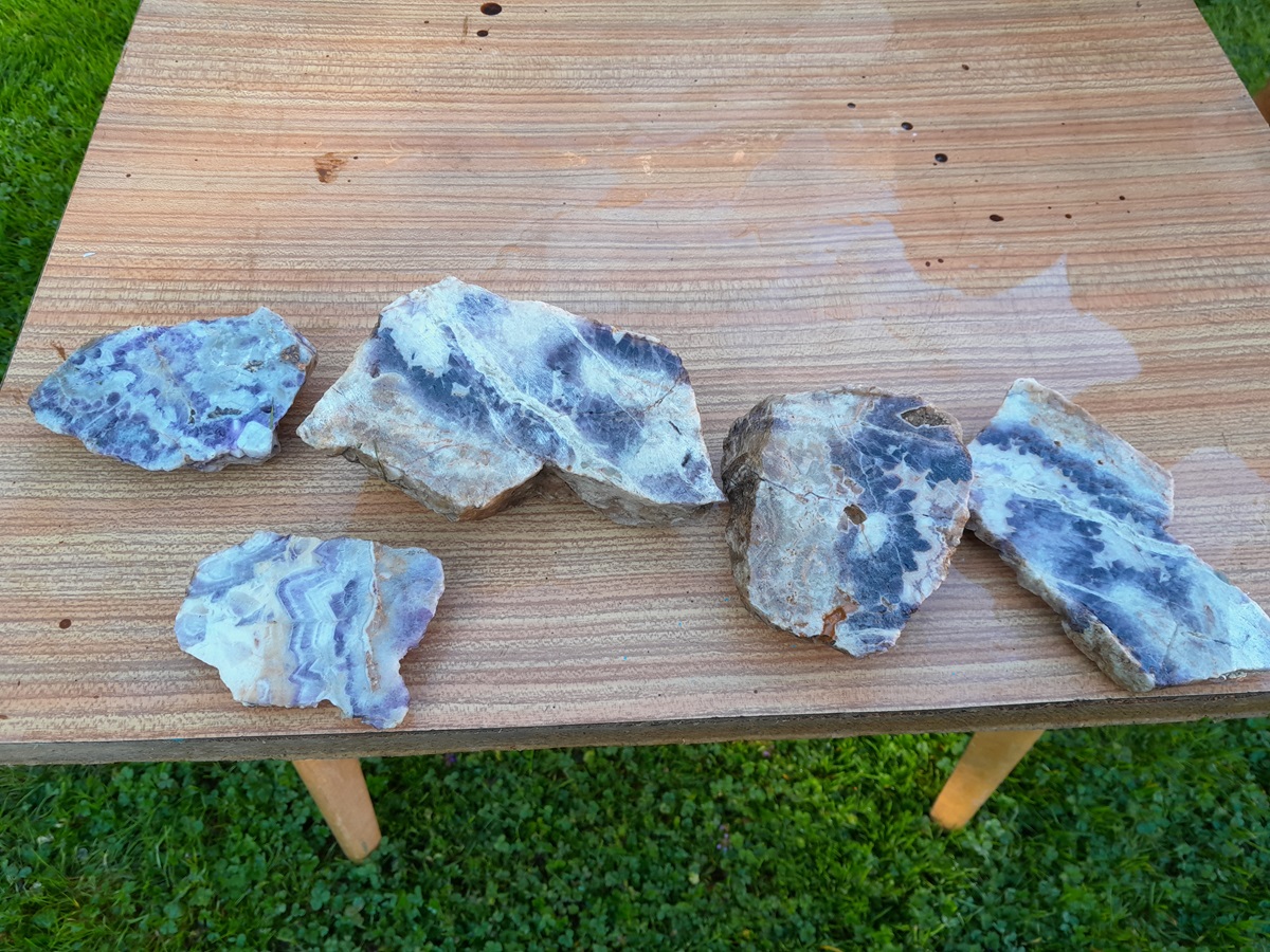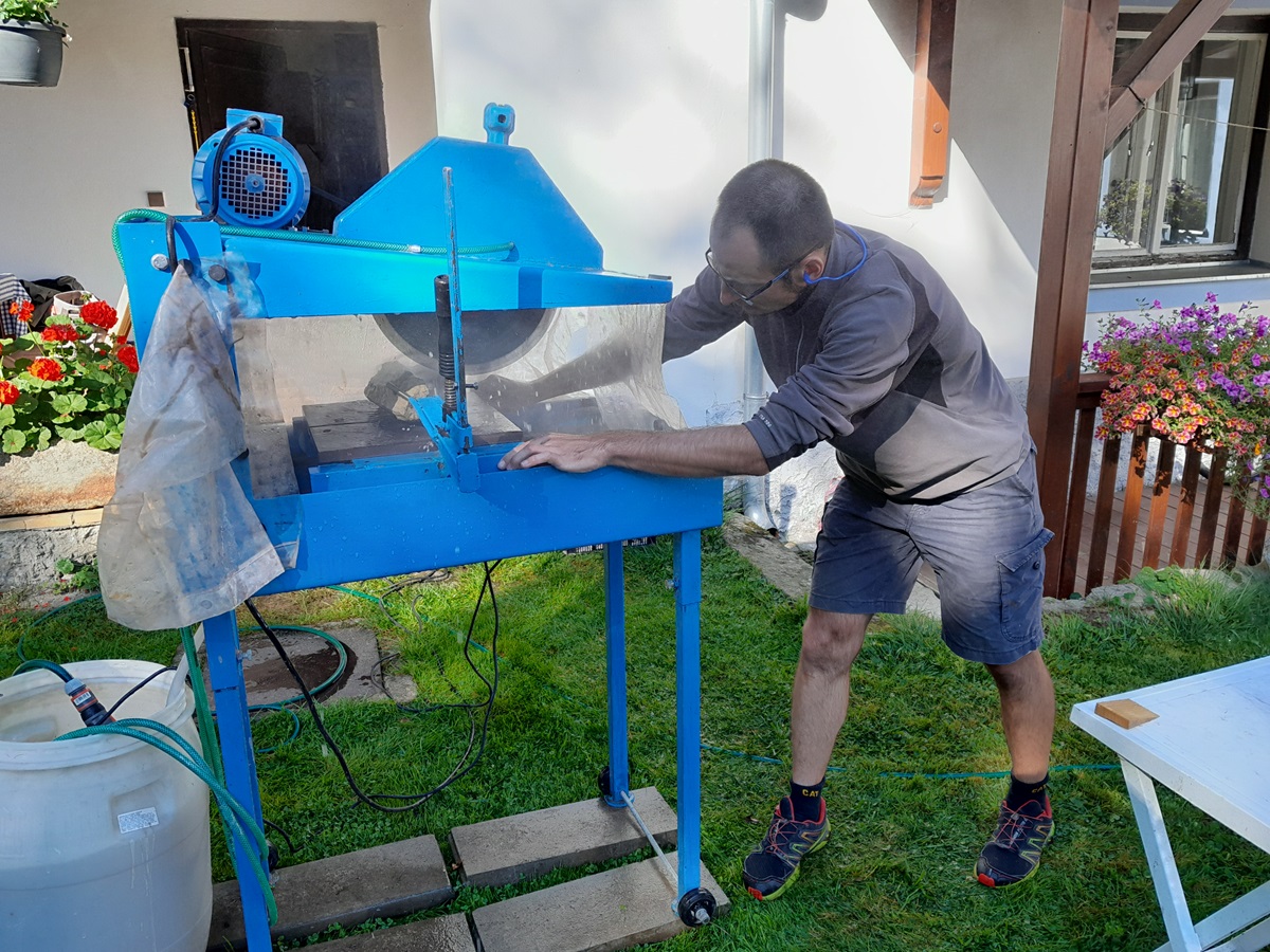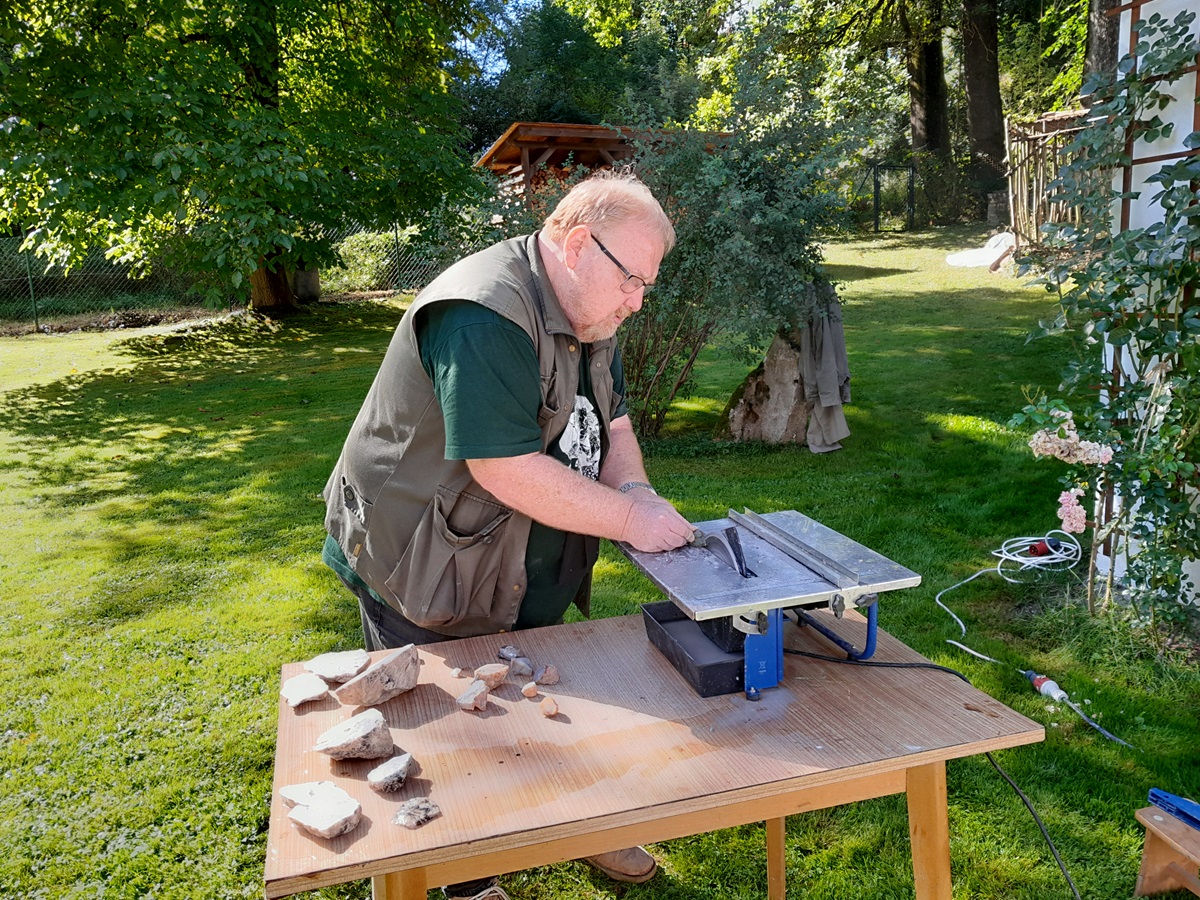 V pořadí druhá letošní klubová akce se uskutečnila v sobotu 6.září na chalupě Jirky Zikeše, který nás pozval na lekci řezání a leštění kamenů. Sešli jsme se v nádherném ránu a hned jsme se dali do díla. Jirka měl vše perfektně připravené: velkou i malou pilu, dva kotouče na broušení a jeden na leštění. Zdeněk Mach si přivezl na zpracování své ametysty, náš přední broukolog Aleš Buček zase přitáhl bednu zkřemenělých dřev, Tomáš Baloun pytlík malých achátů a já nějaké ametysry a opály. Práce nám šla od ruky, ale podobně jako při minulé akci rezání kamenů jsme museli konstatovat, že je to velice obtížná a zdlouhavá práce, zejména pokud chcete mít opravdu krásně vyleštěný vzorek. Tomáš prohlási, že v tomto životě už mu to stačilo a do dalšího broušení a leštění se v dohledných 300 letech nehodlá pouštět. Práci jsme skončili odpoledne příjemně unavení. Byla to velmi pěkná akce, jakožto amatérům se nám naše kameny celkem povedly. Jirko, díky moc a snad zase někdy příště!